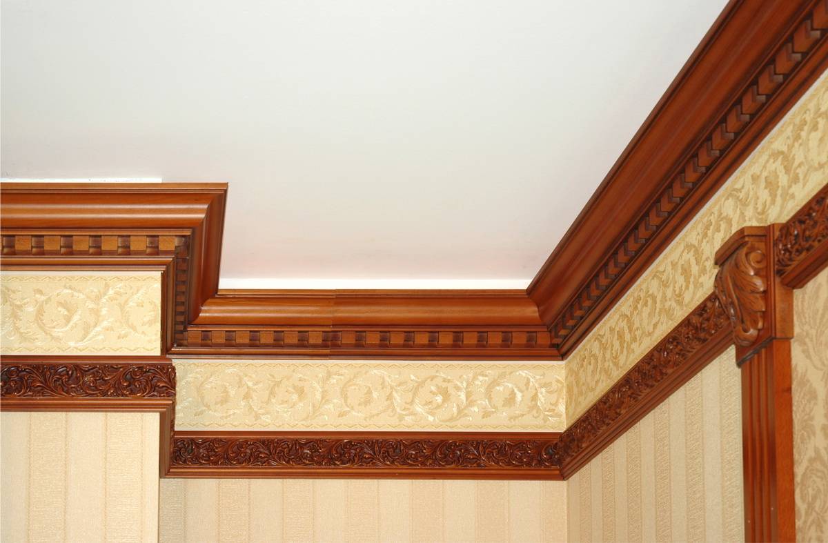Багет из натурального дерева считается самым дорогим. Устанавливается он с помощью саморезов на заранее закрепленные между стенами и потолком деревянные треугольные бруски. Шляпки саморезов маскируются декоративными заглушками или замазываются специальной шпаклевкой, если багет предполагается окрашивать.
