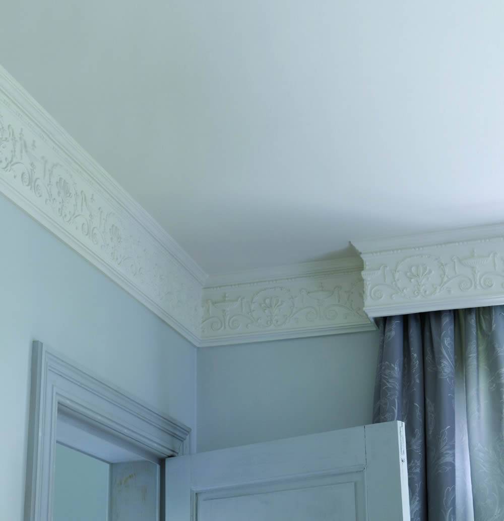 Декоративный карниз из гипса – изысканное лепное украшение для стен . Легкие модели приклеиваются к стене клеем на водной основе или специальной шпаклевкой. Тяжелый широкий декор дополнительно фиксируется саморезами. Шляпки саморезов замазываются гипсовыми смесями, а весь карниз окрашивается полностью или частично.