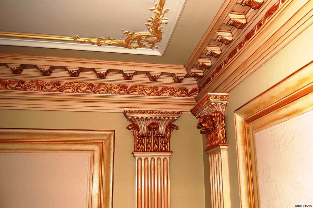Покупая бордюр к натяжным потолкам в вычурном стиле, лучше останавливаться на дорогостоящих моделях из дорогостоящего сырья. По-особому элегантно смотрятся изделия на основе полиуретана с оформлением лепниной или роскошным орнаментом. Еще востребованы изделия из древесины с красивыми узорами.