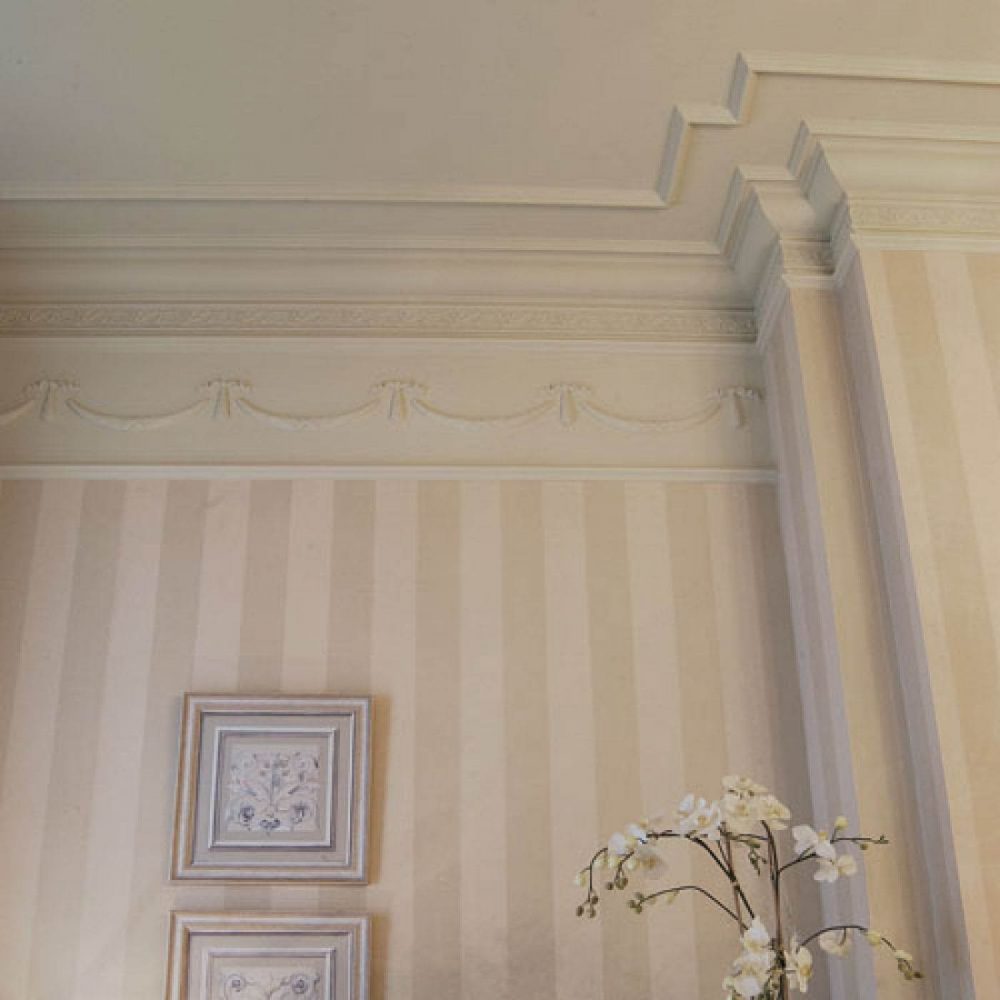 - Гипсовые плинтусы. Конечно, данный вид больше подходит для классических композиций. Очень часто отделка выполняется частично, например, детали устанавливаются исключительно по углам. Фиксация происходит на шпатлевку.