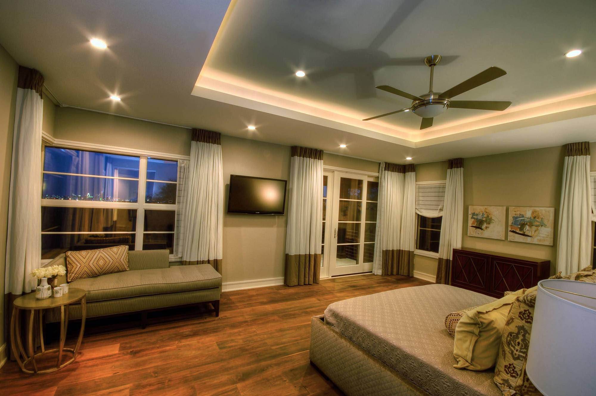 Расширить маленькие комнаты хорошо помогает использование глянцевых поверхностей. но это не тот случай! В спальне яркий блеск будет только отвлекать, поэтому лучше отдать предпочтение матовым потолкам.Стандартное. Такая подсветка проста в исполнении: для нее достаточно простых потолочных шин для ламп и стандартных подвесных светильников.