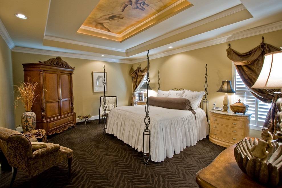 Потолок можно делать однотонным либо разделить цветовую гамму по уровням. Какой вариант выбрать — каждый решает сам. Главное условие – гармония с общим дизайном спальни.