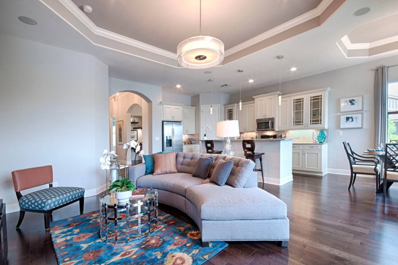 Усилить эффект поможет декоративная подсветка и применение разных материалов при отделке потолка на кухне и в гостиной.Целевое.