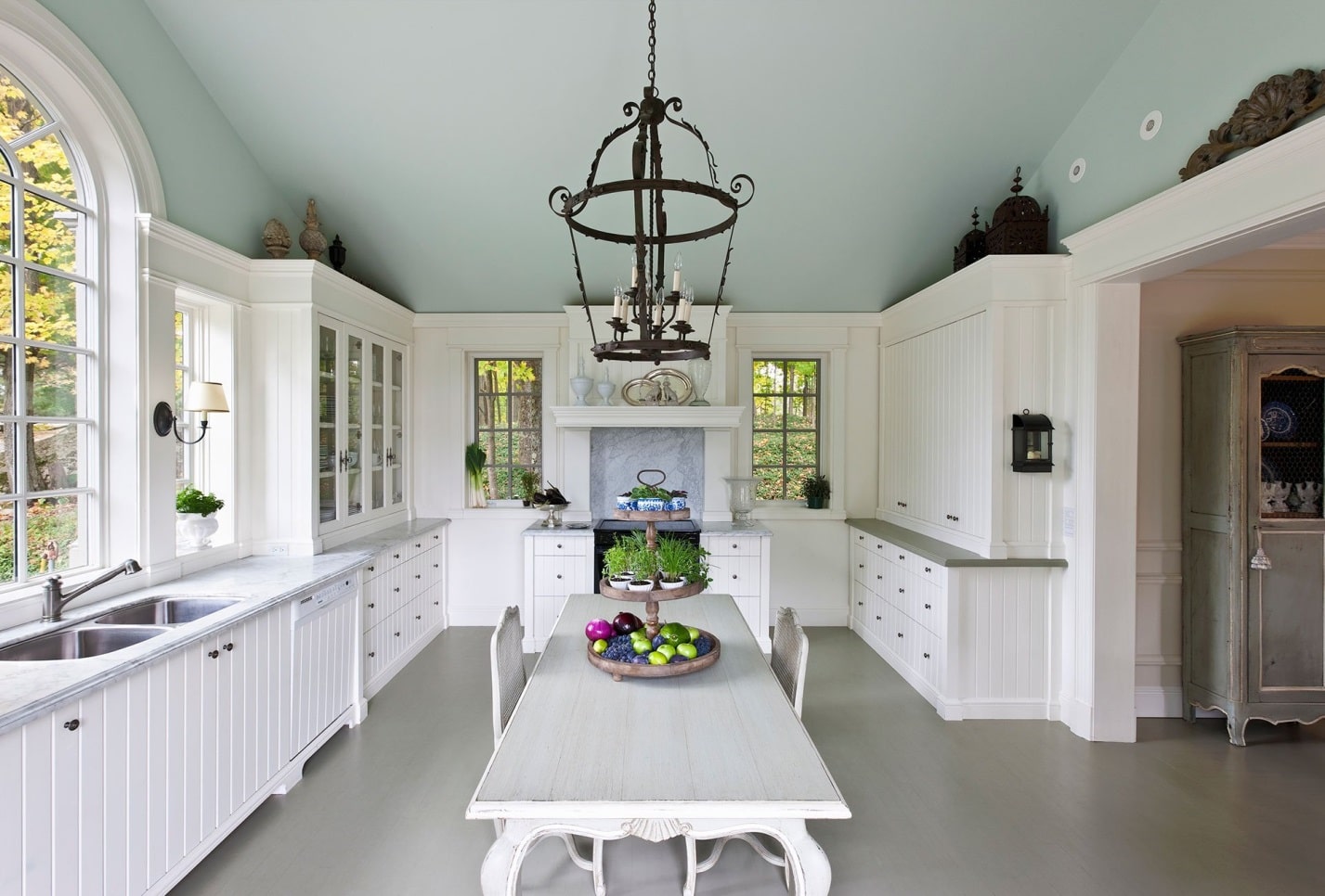На фото белая потолочная поверхность на кухне в скандинавском стиле.