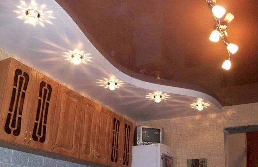 Не знаете какой потолок сделать на кухне? Рекомендуем натяжнойЛегкий блеск на потолке делает помещение визуально вышеФорма и цвет — любыеСтили также могут быть разныеЭто после потопа — вода собралась в одном месте