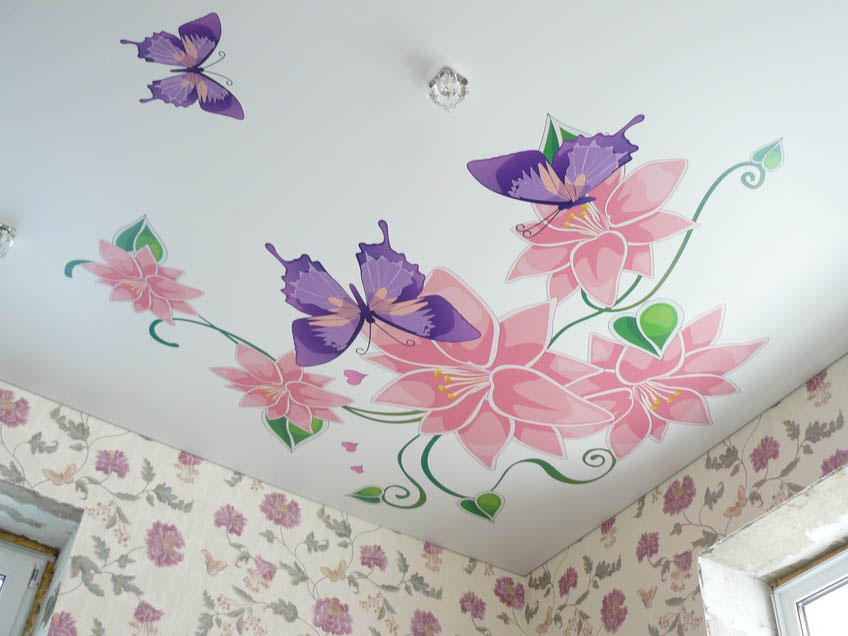 Матовый натяжной потолок вполне может выступать главной изюминкой в интерьере комнаты, если на нем будут изображены красивые цветы и яркие бабочки
