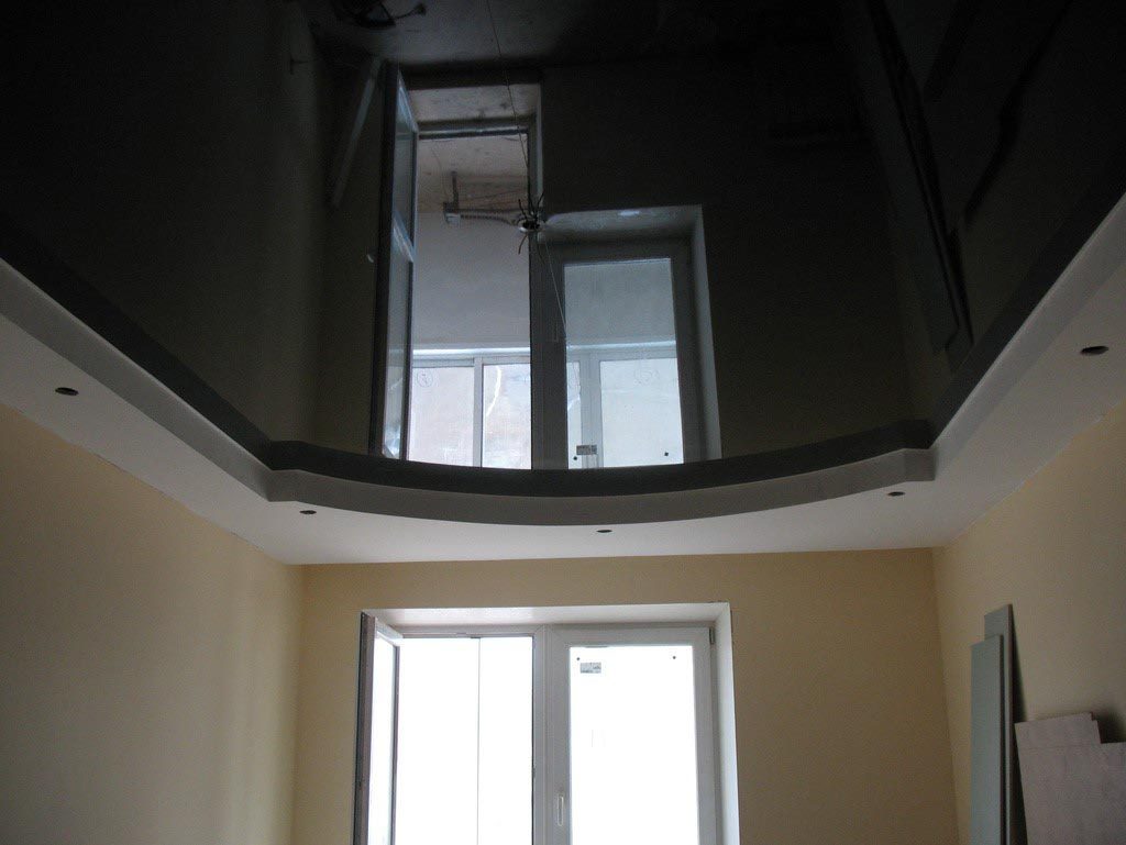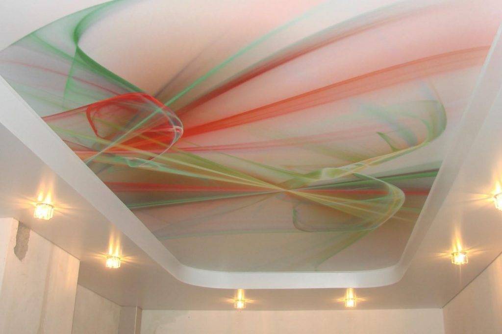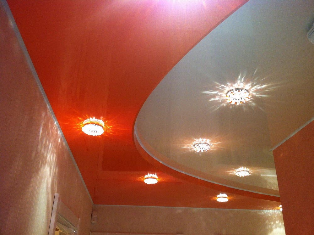 Как выглядит двухуровневый натяжной потолок, можно посмотреть на фото ниже.