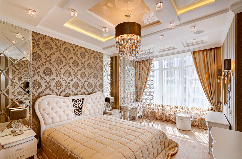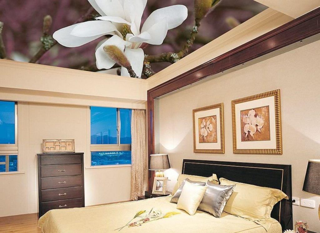 Жених и невеста могут позволить себе оформить в спальне светлый потолок с разнообразными осветительными приборами для создания романтической атмосферы, но нет гарантии, что через короткое время им не придется менять потолок на более светлый, сдержанный один. Яркая облицовка потолка имеет свойство сжимать пространство.
