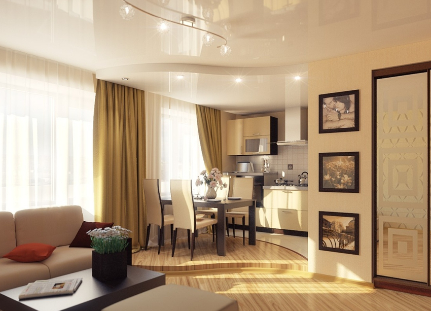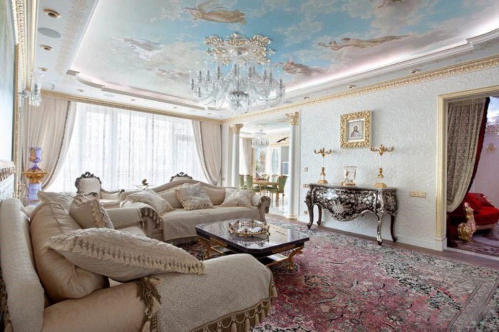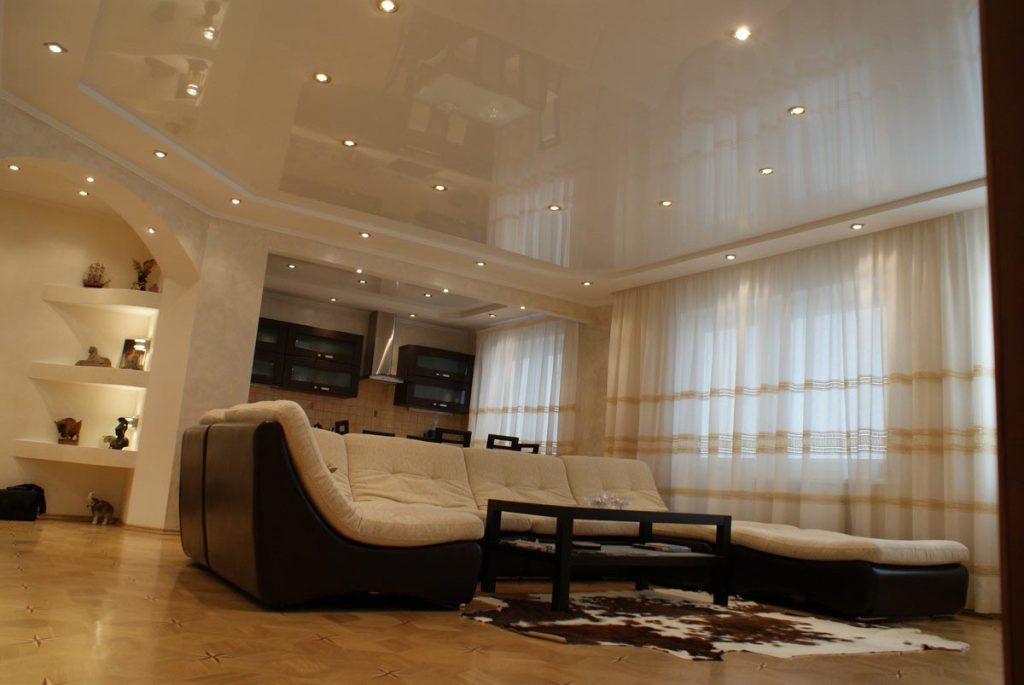 Для классических гостиных подойдут матовые и атласные полотна. Благодаря разнообразию цветов, форм и осветительных приборов можно подобрать дизайн потолка к любому интерьеру. Установка многоуровневой конструкции с правильным освещением позволяет увеличить высоту потолка примерно на 20 см.