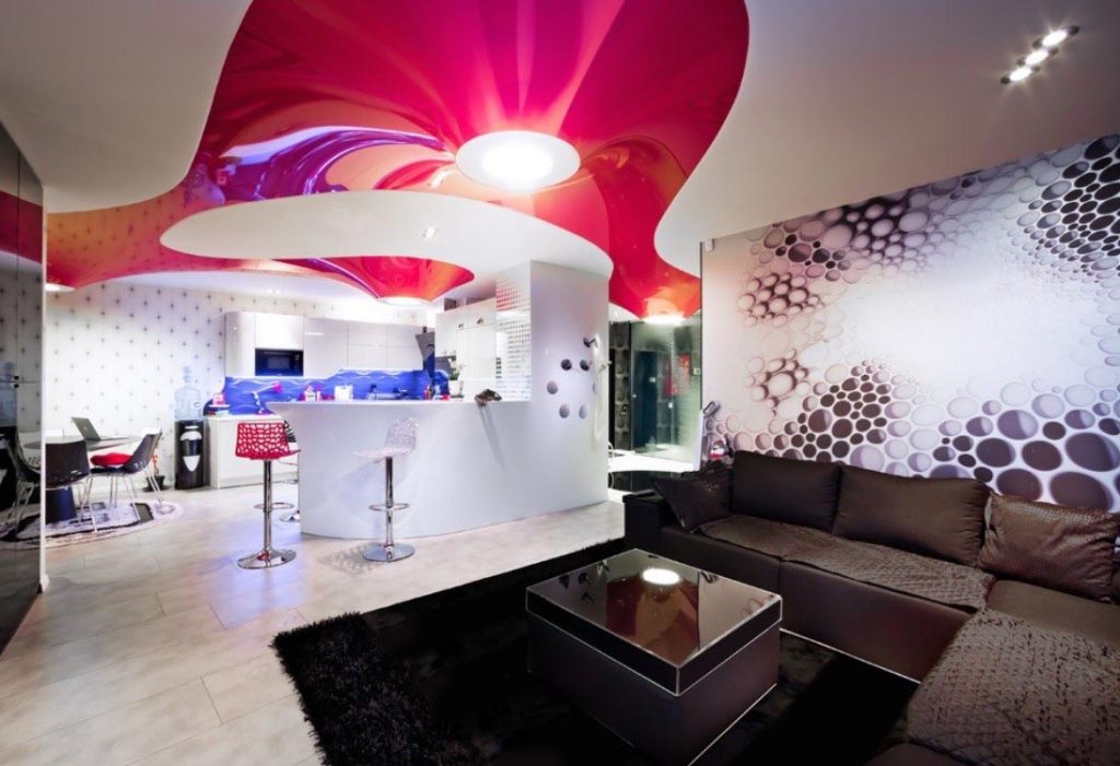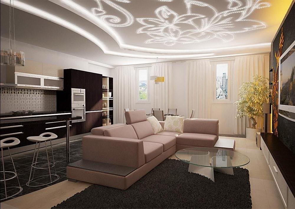Интересно смотрятся необычные потолки с разнообразным рисунком или узором. Такой дизайн сочетается с сдержанным интерьером в нейтральных тонах. В интерьере гостиной на потолке интересно будут смотреться прямые или изогнутые линии света. Такое дополнение натяжного потолка подойдет для сдержанного интерьера в стиле минимализм или хай-тек.