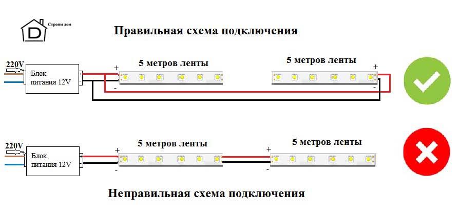 Обычно для одного источника питания достаточно 15 метров. Если есть необходимость увеличить площадь освещения, то для следующего отрезка в 15 метров следует провести отдельное питание. Слишком длинные ленты будут потреблять много энергии, отчего срок их службы заметно сократится.