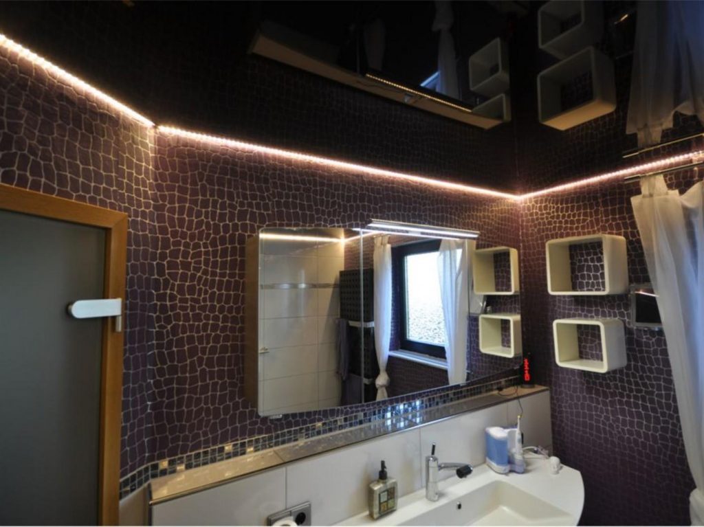 Светодиодная лента по периметру натяжного потолка лучше всего будет смотреться именно в плинтусе благодаря тому, что рассеянный свет будет отражаться от его поверхности. Такое решение можно применить практически в любой большой комнате и даже в ванной. Кстати, при монтаже в ванной не забывайте о правилах безопасности и применяйте ленту с классом степени защиты IP68 – это обезопасит вас и ваше оборудование от короткого замыкания.