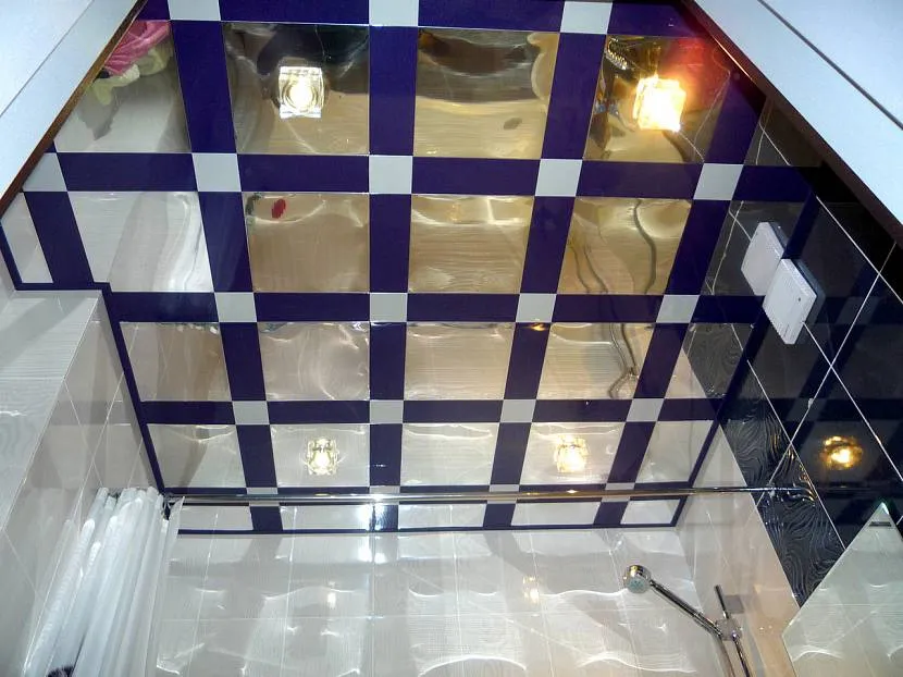 - Зеркальные плиты из полистерола. Материал этого типа производят в рулонах. Лицевая сторона полотна отличается отражающими свойствами. Стоит учесть, что не все плиты подходят для влажных помещений. Также их нельзя использовать в местах крепления галогеновых ламп, при нагревании потолки могут оплавиться;