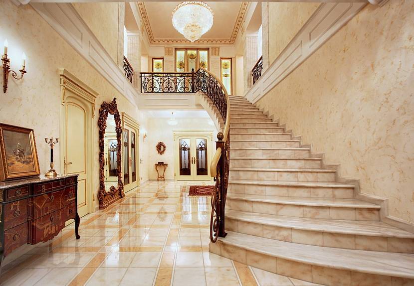 - Возле лестницы, в самом ее начале, хорошо смотрятся фарфоровые или бронзовые статуи. Они являются олицетворением этничности 16-17 веков ‒ самих истоков зарождения данного стиля. К ним относятся: богиня Афродита, Венера Милоская, святой Григорий, библейский герой Давид, задумчивый Огюст Роден.