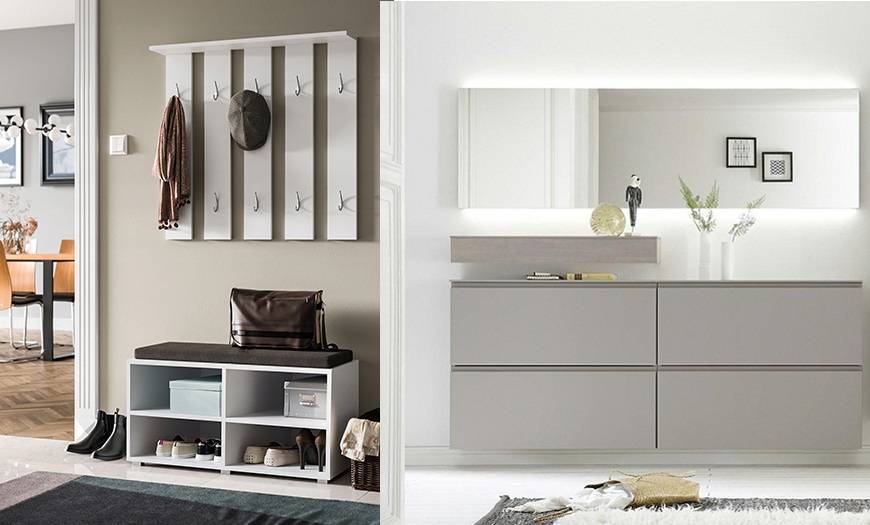 Если размеры прихожей небольшие, то необходимо применить находчивость и изобретательскую смекалку. В таких случаях, совершенно исключены нефункциональные предметы: мебель подбирается только по прямому назначению — вешалка, обувница и пуфик на колесиках. Вариант расстановки мебели-трансформера в коридоре обеспечит максимум свободного места и одновременно желаемый комфорт.