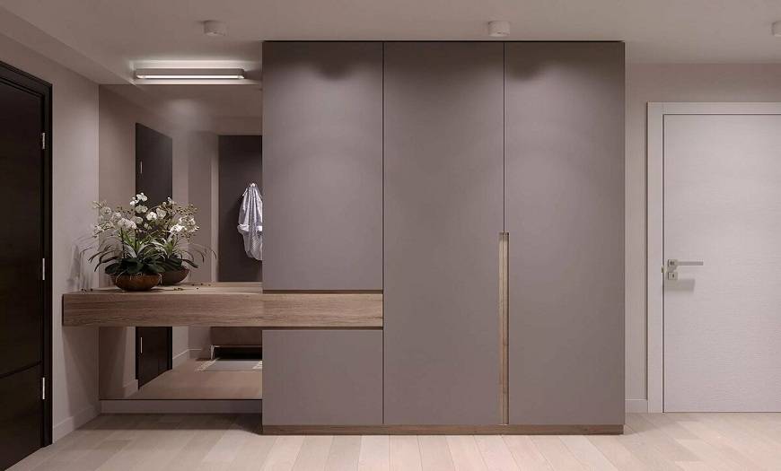 В квартирах, где входная зона объединена с гостиной, продуманное размещение шкафов будет выполнять функцию перегородки, разделяя пространство на жилую и нежилую части.