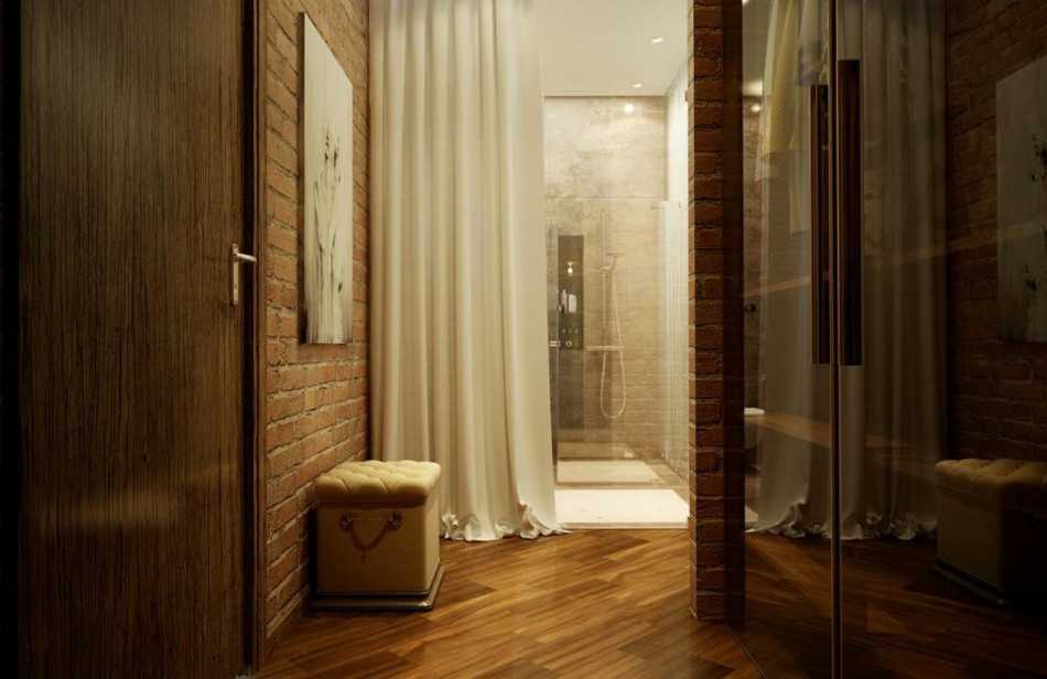 Противоположные стены с разной обработкой, например, красно-коричневая кирпичная кладка и декоративная штукатурка, привлекают внимание посетителей и выглядят очень стильно. Если удастся приобрести антикварное кресло с резными ножками и потертой обивкой и поставить возле необработанного участка стены прихожей, то лучшего украшения для узкого коридора в стиле лофт и не придумать.