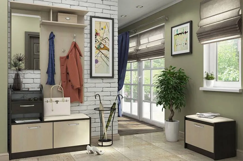 Для небольшой прихожей подойдет миниатюрный шкафчик для обуви и открытая система хранения вещей, римские шторы добавляют пространства Источник stroy-podskazka.ru