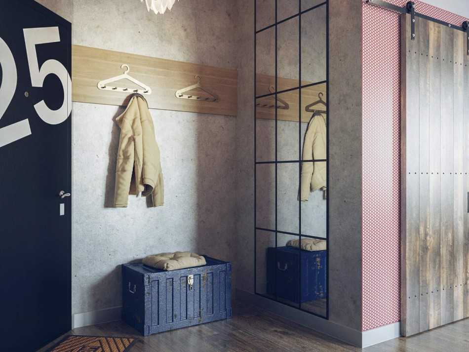 Стиль лофт в интерьере создан за счет меблировки и двух заметных деталей: напольного зеркала и железной вешалки для одежды. Пространство, прикрепленное к стене, увеличивает пространство. Шкафчик в холле вообще не требуется.
