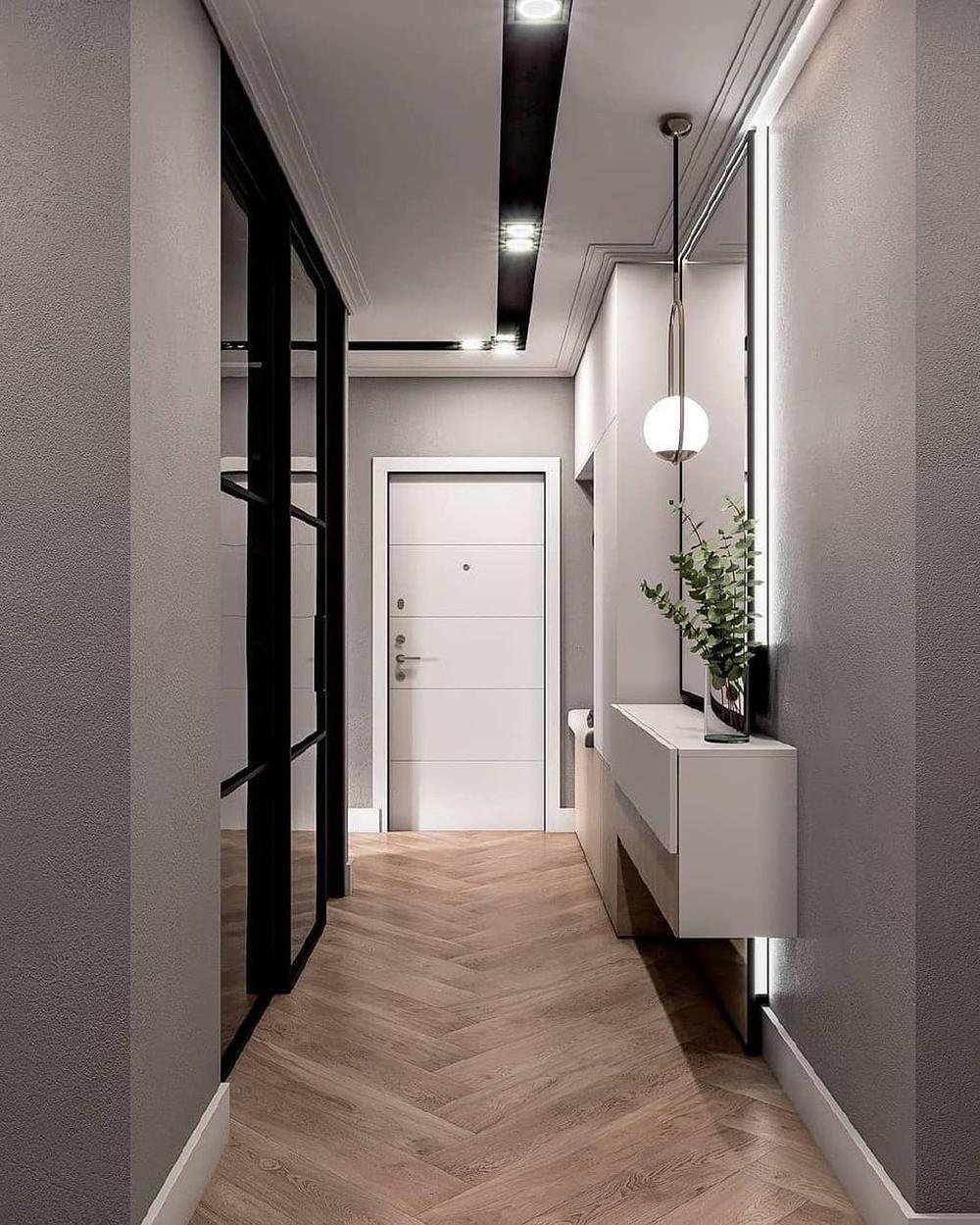 Принципы минимализма хороши для небольшого прохода. Выбирайте для отделки стен базовые оттенки, без узоров и фактур. Декор используйте по минимуму; шкафы старайтесь выбирать встроенные, чтобы не резать пространство.