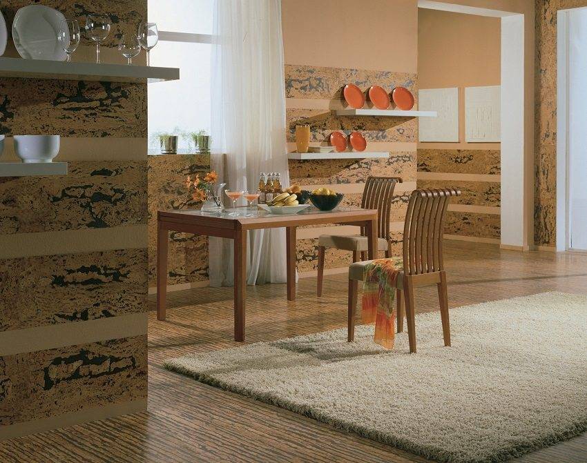 Декорирование некоторых участков помещения пробковыми обоями привнесет ноту тепла и оригинальности в интерьер