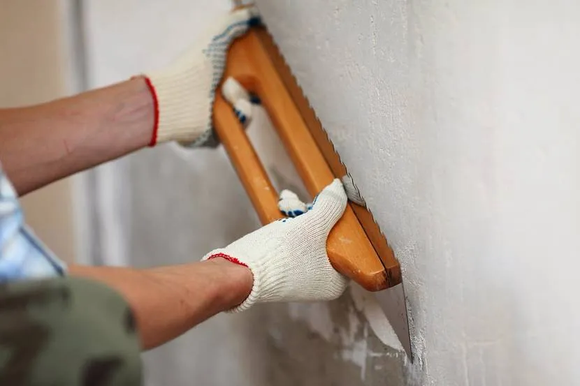 - Нанести однородный клей на стену зубчатым шпателем. Слой должен быть тонким (не более 1,5 мм).