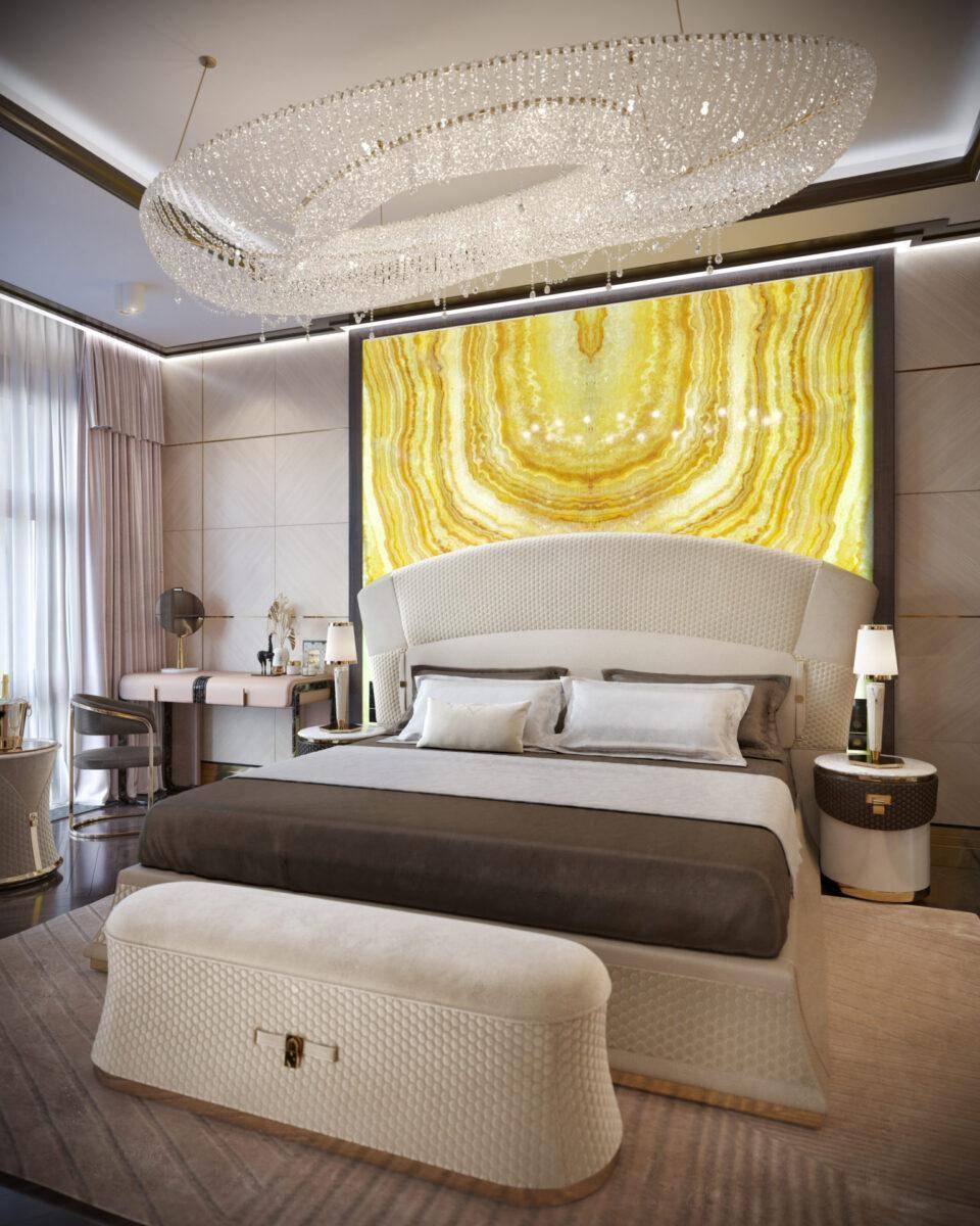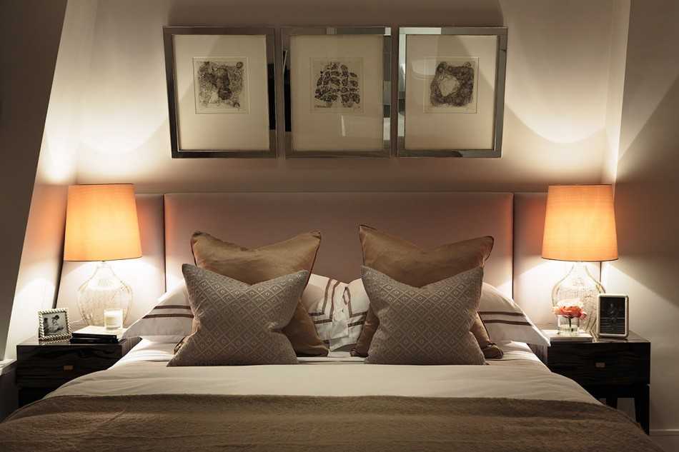 Современность и элегантность в стильный дизайн интерьера спальни 2022 можно привнести с помощью картин, размещенных на одной стороне кровати, или по центру