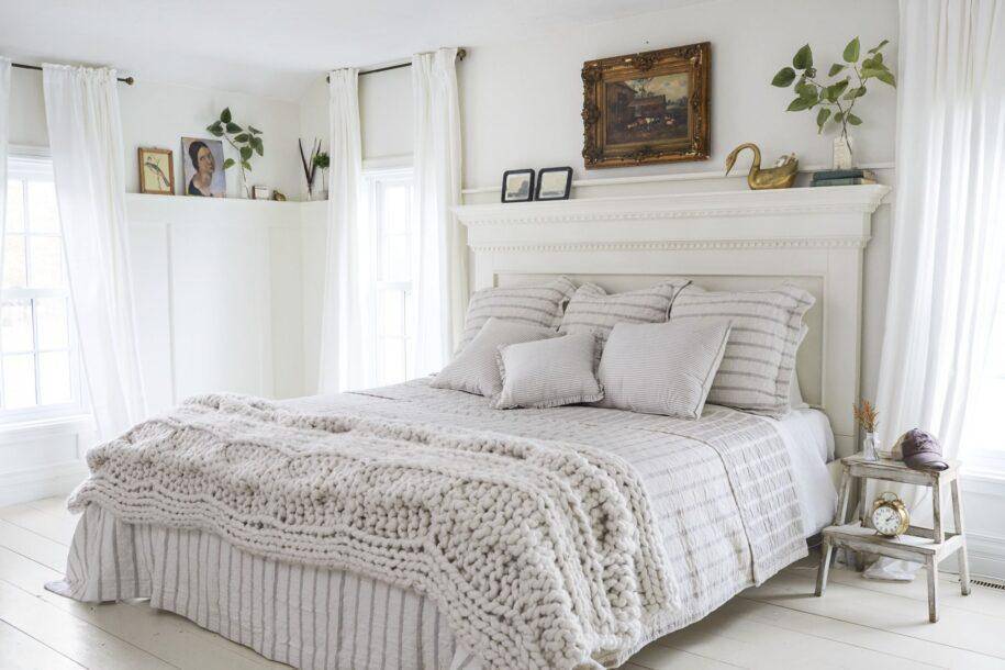 - Jamie Bush & Co, используя пастельные тона, различные источники освещения, создал уютную спальню.