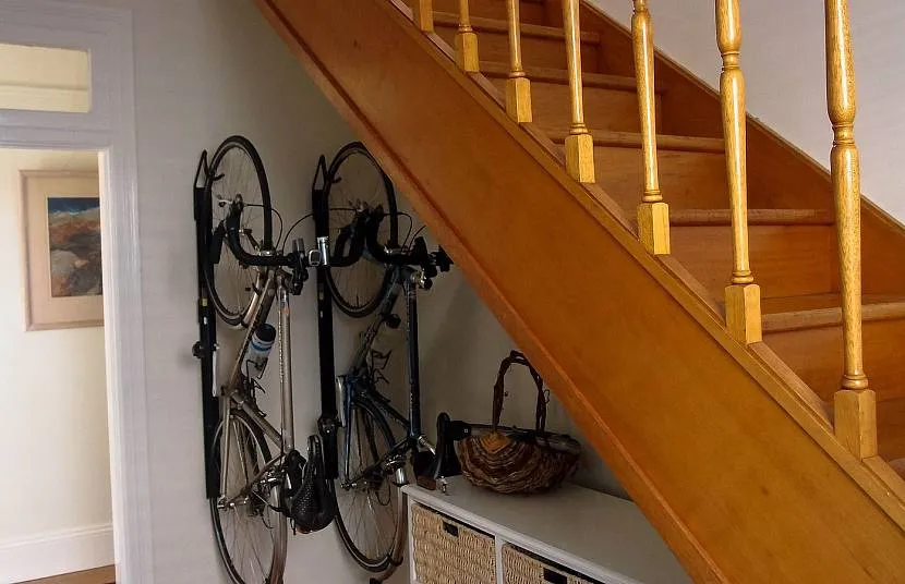 Зону под лестницей стоит освободить для хранения спортивных принадлежностей. В углу ставят лыжи, под широкой лавкой – скейт, собранный самокат или гироскутер. Участок можно полностью переоборудовать под «стоянку» для велосипедов. На полках стеллажа легко разместить: