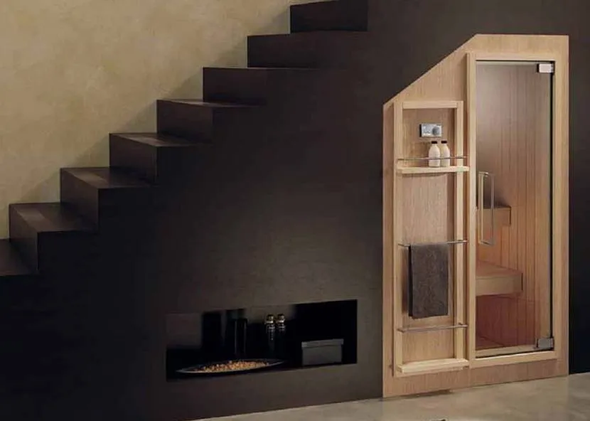 Под лестничным маршем дизайнеры рекомендуют расположить сауну. В небольшую кабину с электрическим обогревом поместится 2-3 человека, рядом устанавливают душ. Невысокие ниши и секции рядом с конструкцией используют для хранения банных принадлежностей, моющих средств и текстиля.