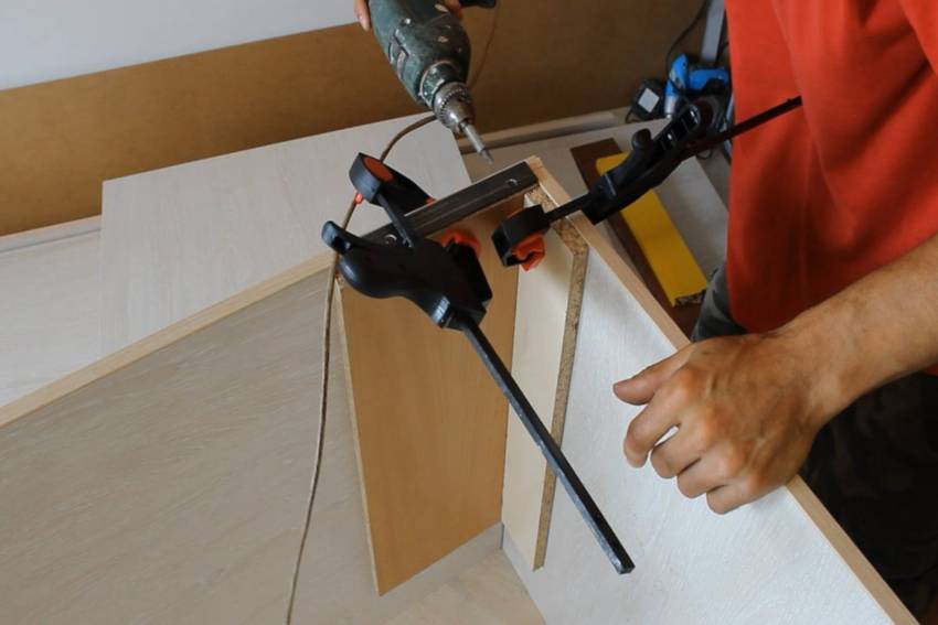 Основные инструменты для изготовления шкафа под лестницей — дрель, лобзик и отвертка. Сразу после изготовления рекомендуется промаркировать каждую полку, чтобы не перепутать детали в процессе установки.