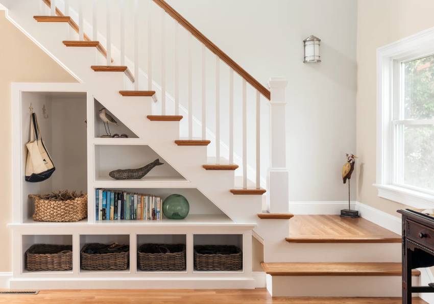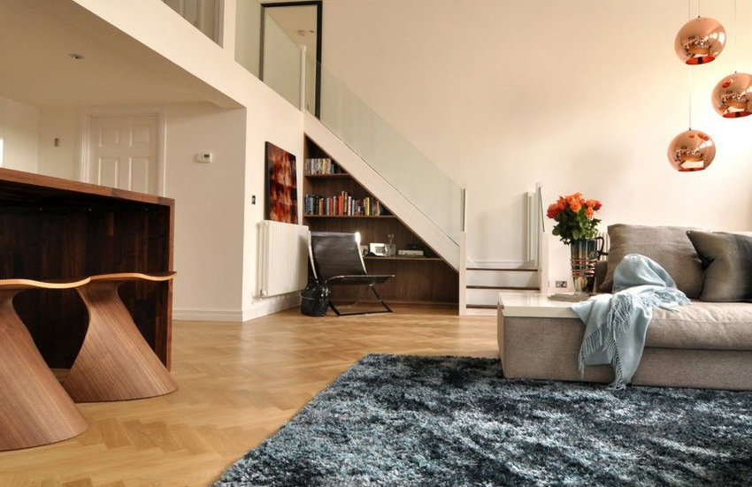 Если вы планируете реализовать эту идею, обязательно обратите внимание на строение самой лестницы: лестницы с подступенками (вертикальными элементами, перекрывающими зазор между двумя соседними ступеньками) лучше подходят именно для организации помещения во внутреннем пространстве лестницы