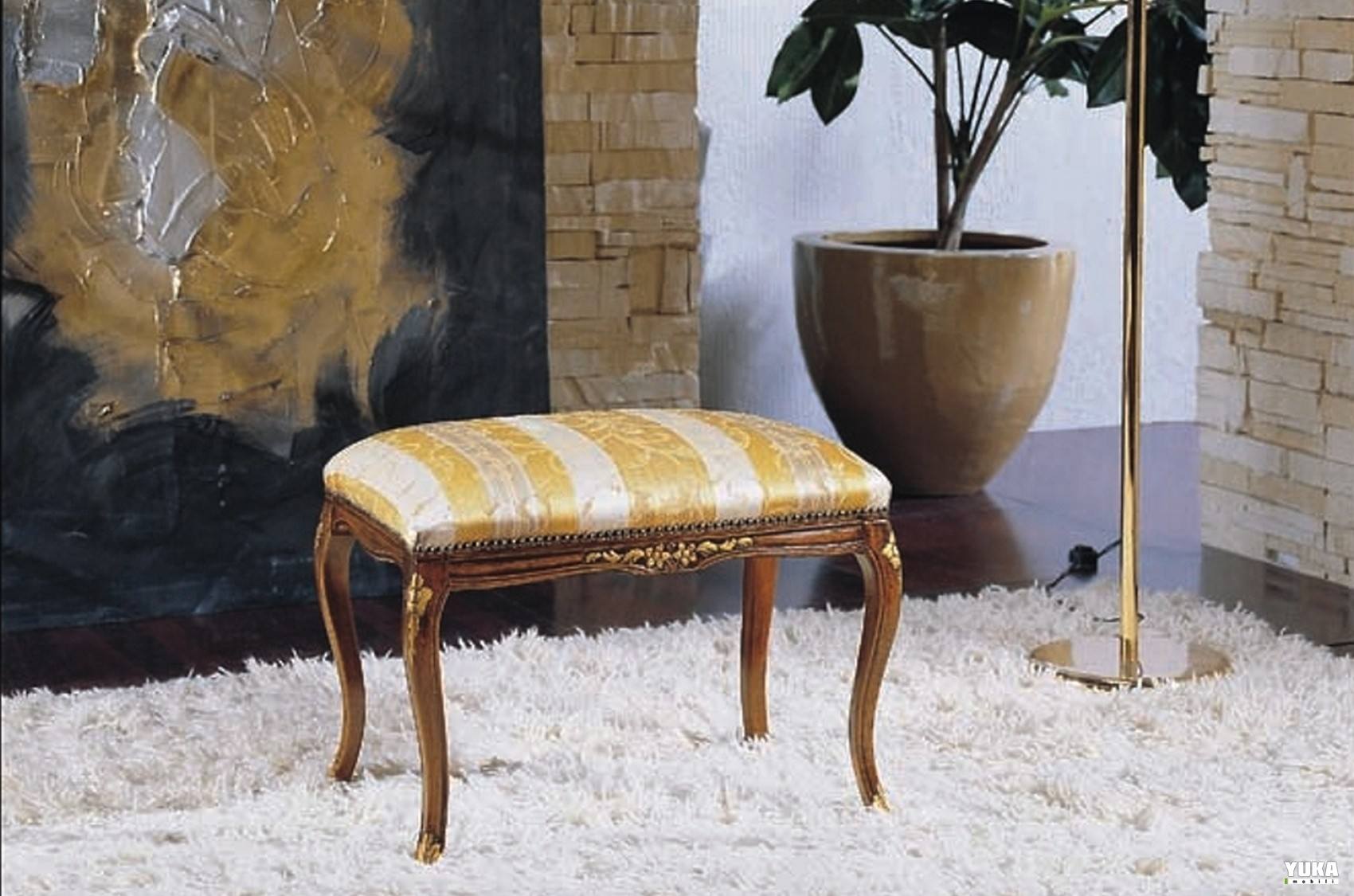 - классический – пуфик с фигурными деревянными ножками, оббитый кожей, богатыми тканями и декорированный заклепками. Основа сидения – с резным декором, золоченные ручки прибавят пуфику изысканности и шарма. Возможна отделка под слоновую кость , такой пуфик из утилитарной вещи превращается в произведение мебельного искусства