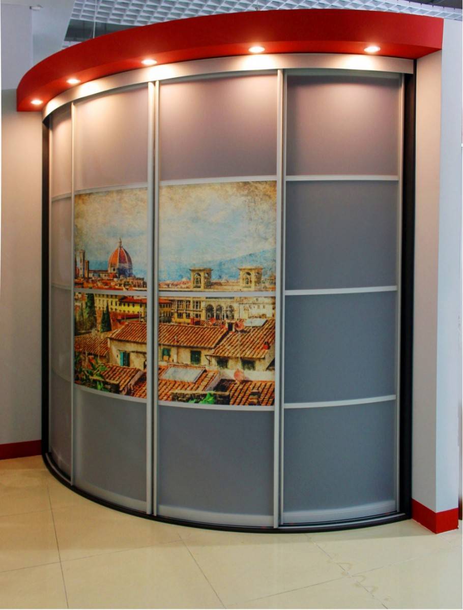 Радиусный шкаф вогнутый, волнообразный, выпуклый или угловой может быть сделан из пластика или стекла. Имеется несколько вариантов оформления фасада конструкций: фотопечать, пескоструйный рисунок, лазерная гравировка.