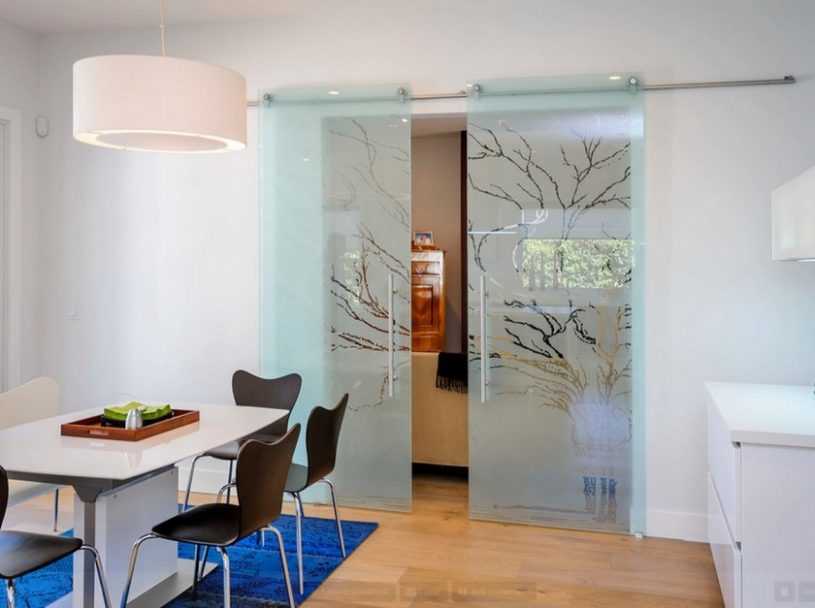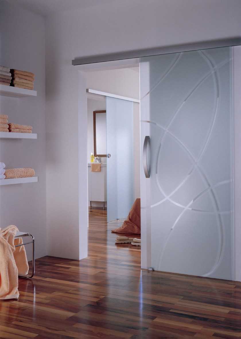 Несмотря на то что выбор материалов, из которых изготавливаются раздвижные двери, велик, наиболее часто используют стеклянные и деревянные конструкции. В настоящее время все большей популярностью пользуются зеркальные двери. На них, как и на обычные стеклянные можно нанести красивую роспись, пескоструйный узор или фьюзинг (одна из популярных техник создания витража). Зеркальные поверхности могут быть выполнены из закаленного стекла и триплекса (многослойного стекла), что значительно повышает их прочность. Пластик чаще всего используется в молодежных интерьерах (одноцветный полупрозрачный или с тонировкой).