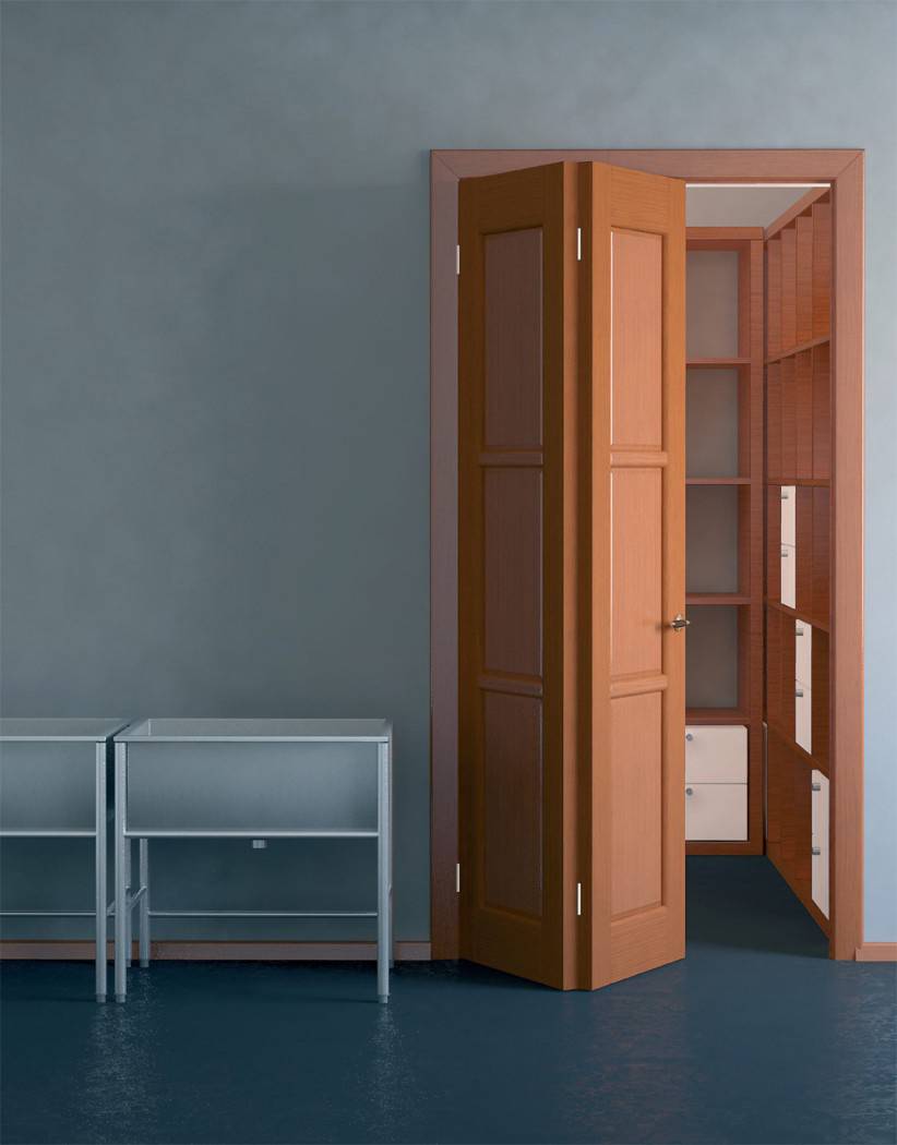 Двери купе для гардеробной такого плана по способу крепления схожи с дверью «техно», поскольку имеют только верхнюю направляющую рейку. Само полотно двери состоит из двух створок, складывающихся при открытии словно закрывающаяся книга. Двери такого типа имеют интересный эффектный вид, однако, при их установке следует учитывать возможность предоставления необходимого пространства для сложенного механизма при полном открытии.
