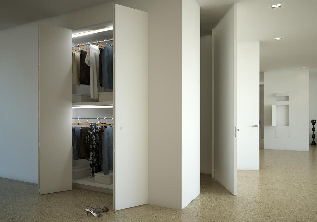 Возможно, вас заинтересует система «умный порог»: при закрытии дверей происходит опускание встроенного порога из паза дверного полотна, а при открытии порог автоматически поднимается (что позволит отсечь проникновение неприятных запахов в гардеробную).