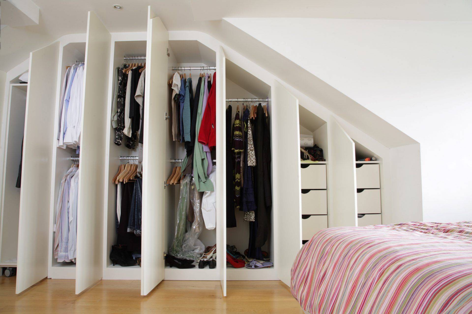 - Чердак. Специфика этого помещения заключается в наличии наклонных плоскостей. Это усложняет дизайн гардеробных. Часто их делают без дверок в виде открытых полочек или отсеков с занавесками.