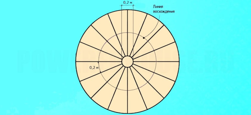 Для винтовой, спиральной лестницы и для забежных ступеней существует оптимальный радиус поворота. Он равен сумме удвоенной ширины проступи и ширины лестницы. При этом проступь измеряется не по краю, а по средней линии.