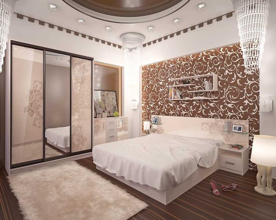 Основное требование к дизайну такой спальни – визуально расширить пространство. Его можно увеличить за счет светлой цветовой гаммы, использования зеркальных и отражающих деталей.