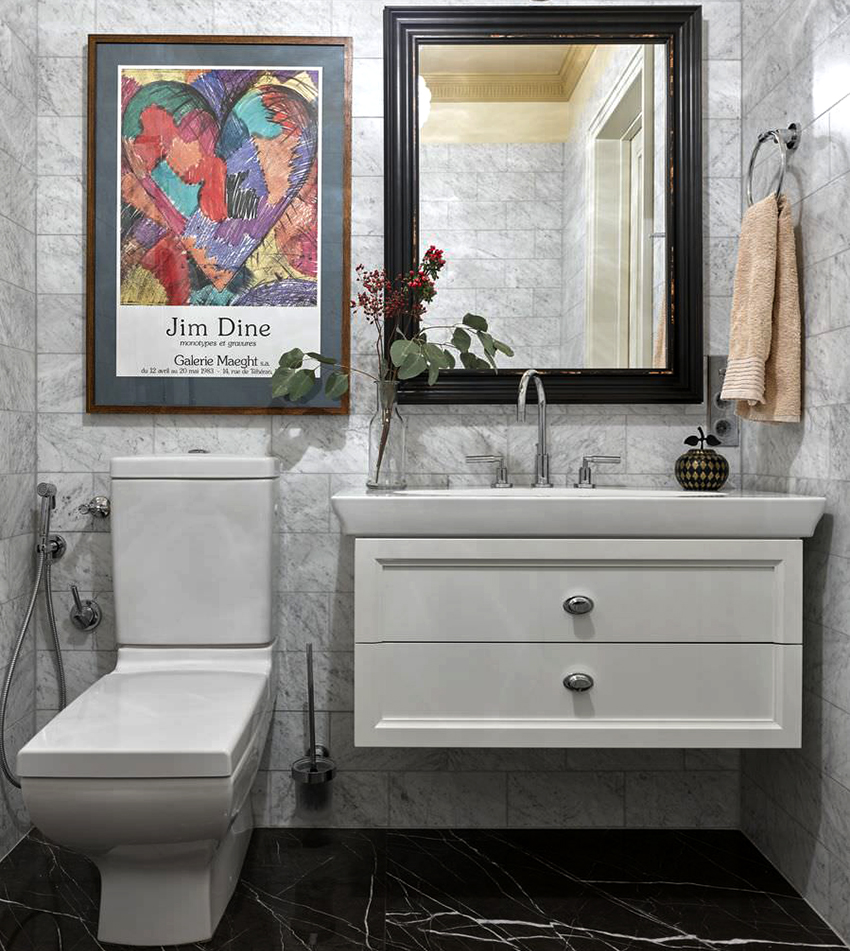 Если вам очень хочется туалет в стиле арт-деко с черно-белым решением, то сделайте доминирующим светлый цвет, а черным создавайте акценты, фрагменты или вкрапления. Также стоит поступать и с остальными представителями темного спектра. Они должны щедро разбавляться пастельными красками. Хорошо выглядят комбинации коричневого с бежевым. К темно-синему можно добавить белого, кремового или голубого цвета. Темно-фиолетовый стоит смешать с бледно-желтым, светло-сиреневым, бежевым и белым оттенком.