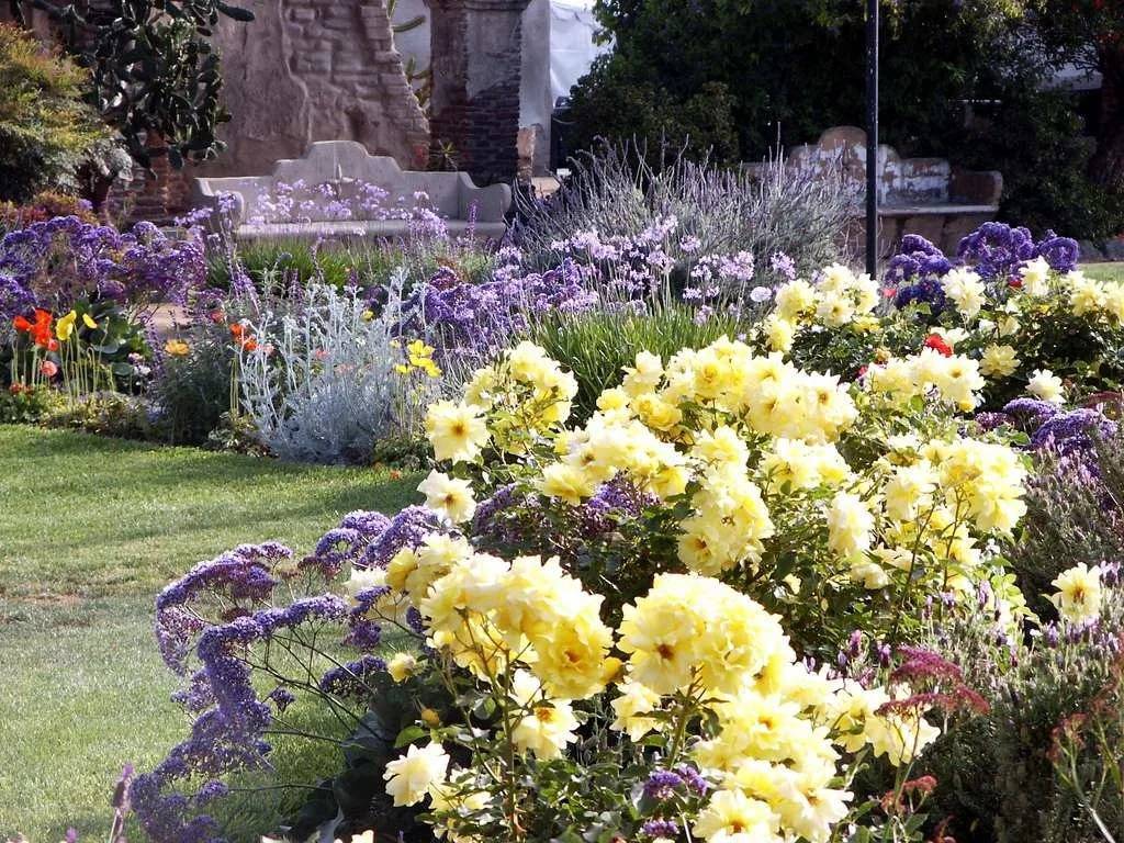 В ландшафтном розарии важно продумать колористику цветника. Очень удачно сочетание белых и кремовых роз, разбавленных светло-сиреневым цветом лаванды