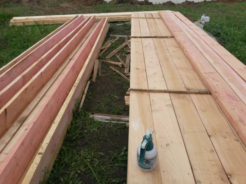 - монтируем настил пола и обрешетку крыши (настелить пол можно до сборки стоек и верхней обвязки);