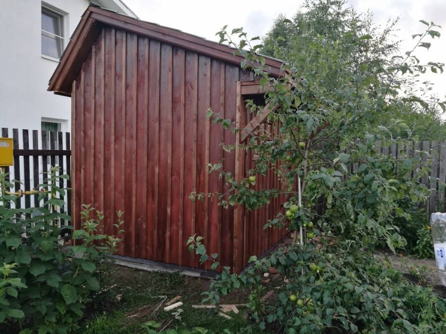 Последними штрихами устанавливалась ветровая доска. Затем сарай был обшит вагонкой и покрашен краской в тон остальным постройкам на участке. Сарай своими руками на готовом фундаменте построен за два выходных дня. Обшивка вагонкой и покраска были значительно позже -почти через месяц.