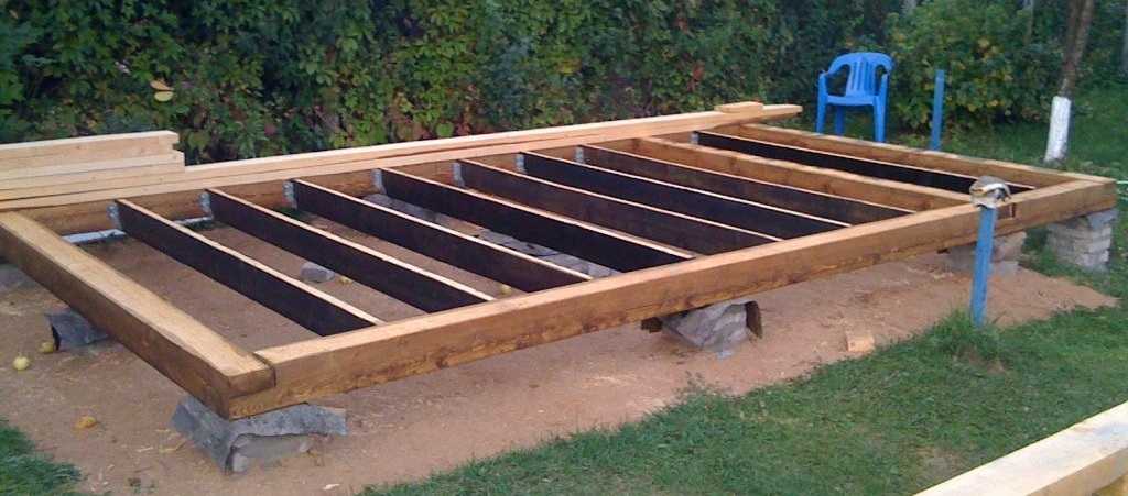 Все элементы из древесины обязательно защищают от гниения при помощи антисептической пропитки. Из бруса делается обвязка, к которой крепят лежни, на них устанавливают лаги. Поверх лагов стелют сперва черновой пол из досок, затем фанеру. На обвязку устанавливают столбы из бруса, составляющие опору каркаса.