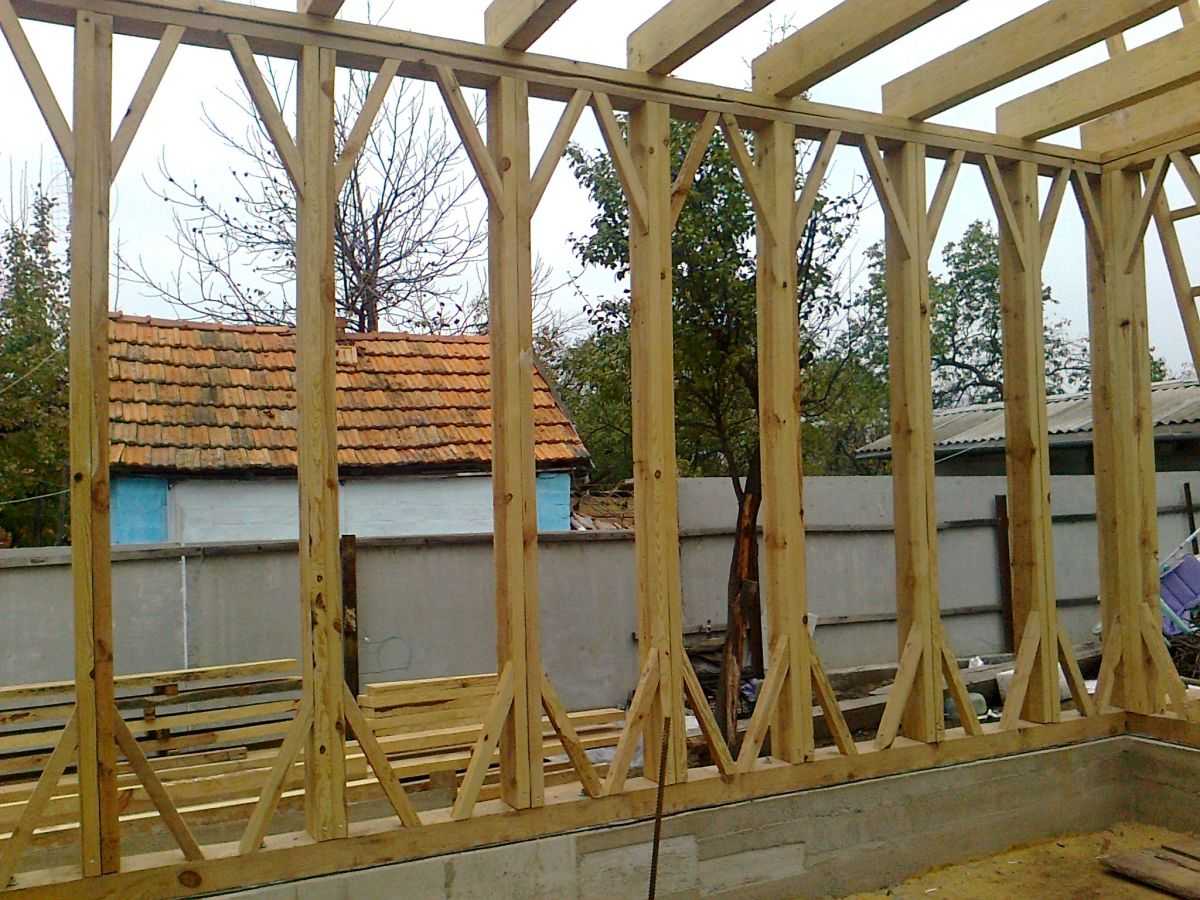 Для сборки каркаса использованы доски 100*50 мм, расстояние между стойками 600 мм, стропила установлены с таким же шагом. Стропильная система собиралась из 150*40 мм.