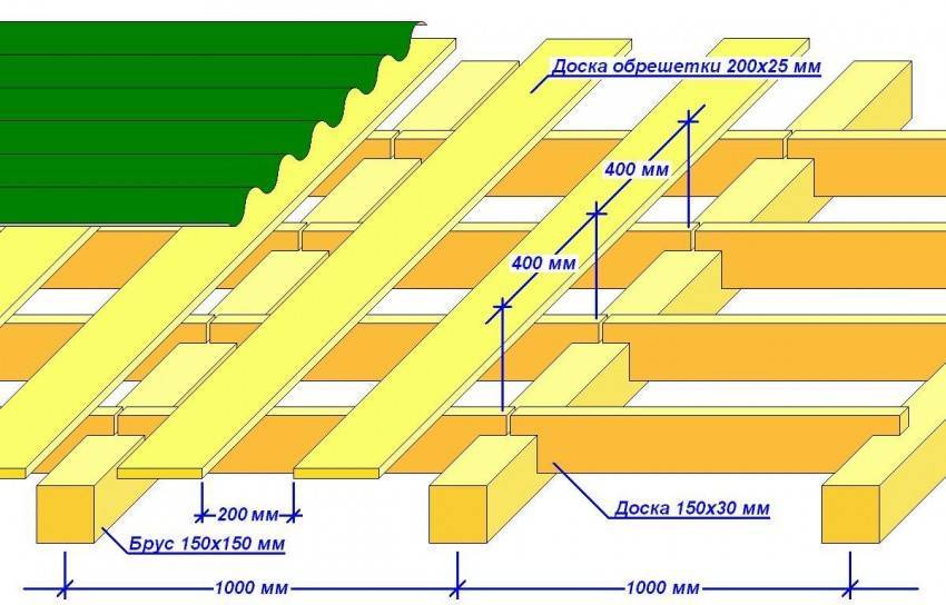 Далее собиралась стропильная система — доска 150*50 мм, на нее — обрешетка под металлочерепицу. Была выбрана, так как таким же материалом крыта дача.