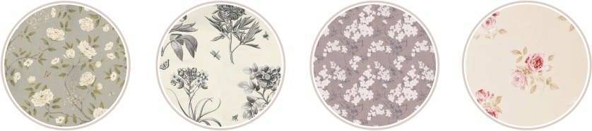 - Подойдут однотонные пастельные оттенки — белый, бежевый, светло-серый, голубой, розовый. Узоры: мелкий или крупный цветочек, растительный узор.
