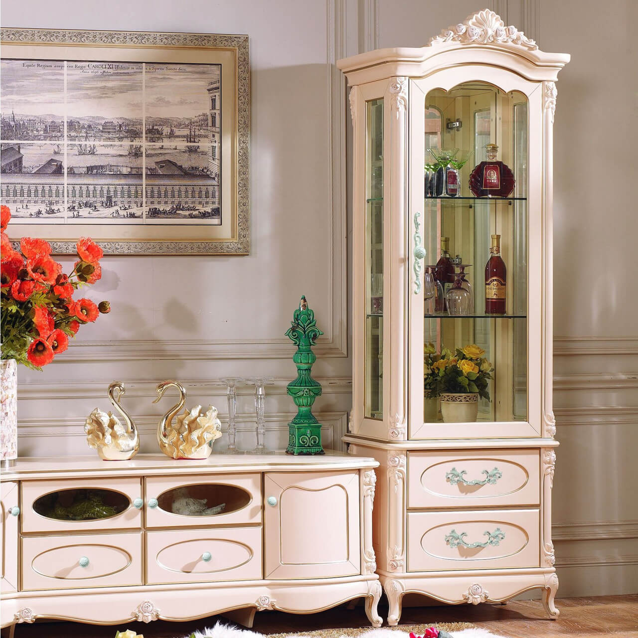- Барокко и рококо. Это изысканные и роскошные дворцовые стили. Мебель изготавливают только из натуральных материалов с большим количеством деталей отделки. Резьба, инкрустация из натурального камня, позолота, изогнутые ножки – основные декораторские приемы при украшении сервантов и буфетов в дворцовом стиле.