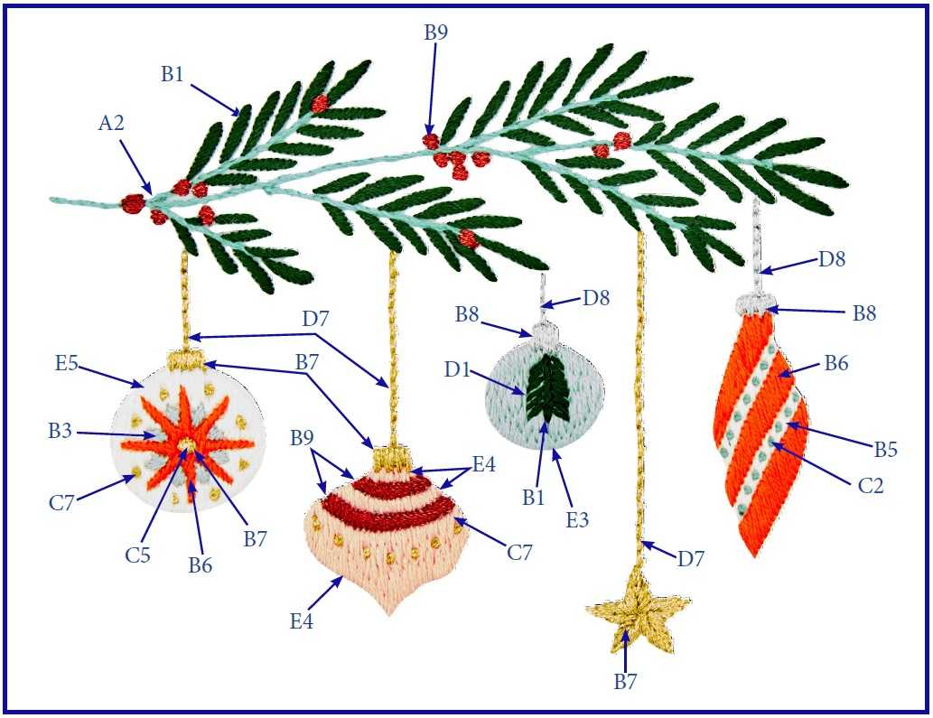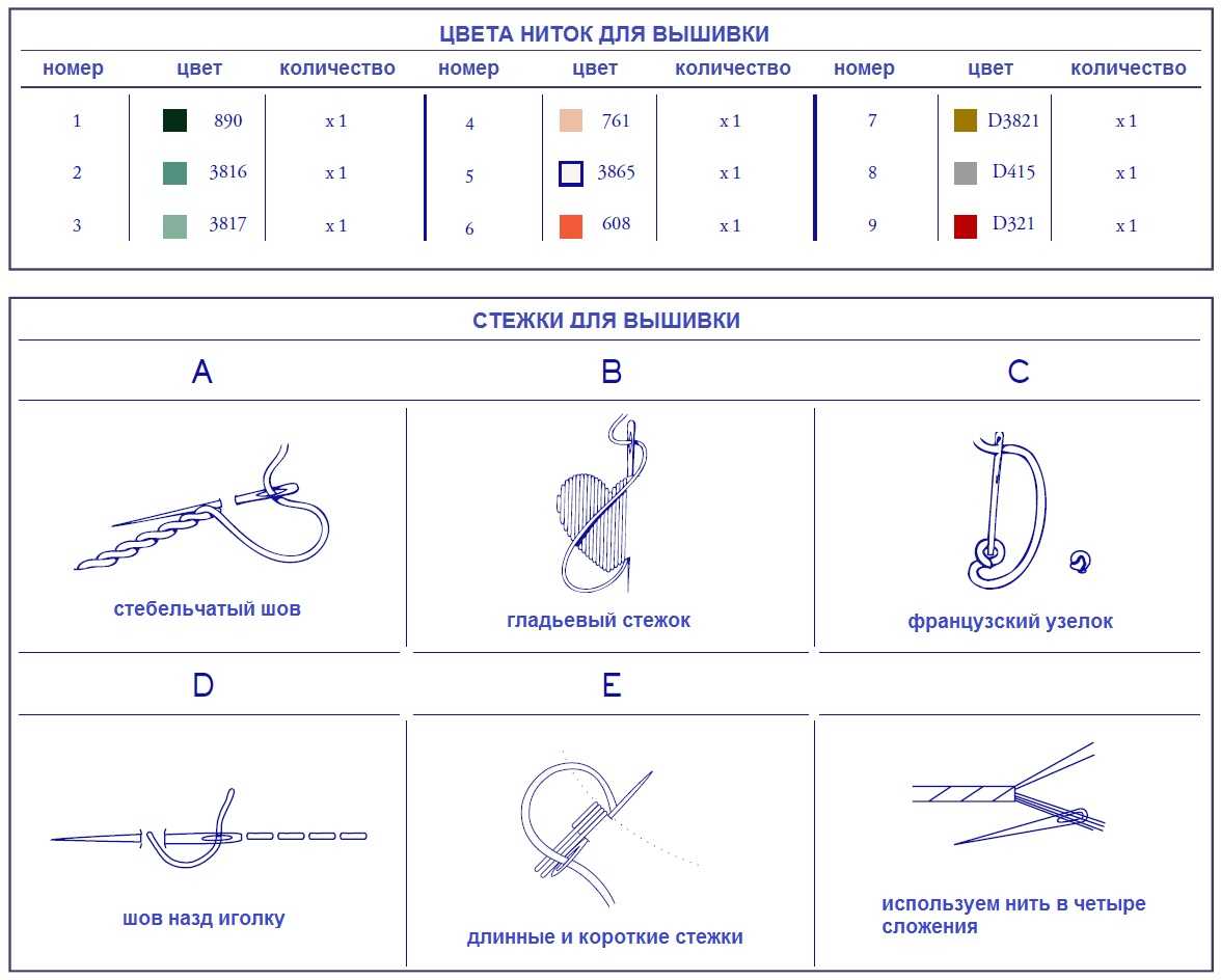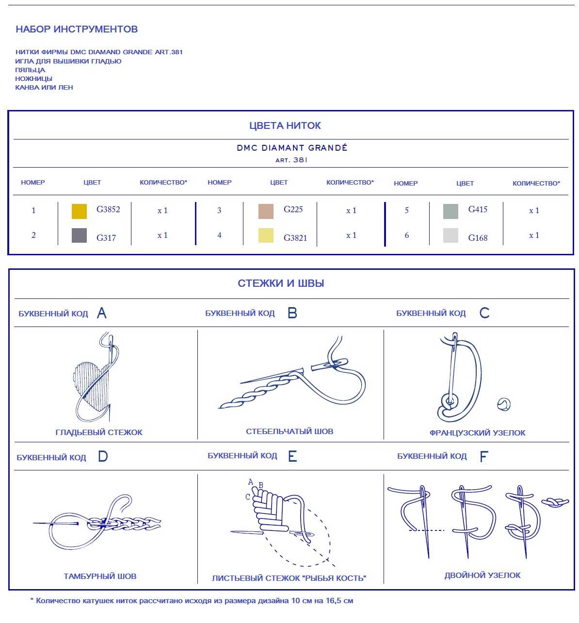 Мотив состоит из нескольких видов вышивальных стежков, их виды указаны буквенно-цифровыми кодами на схеме.